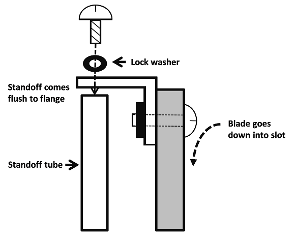 Place the provided lock washer over the top of the standoff, and thread the provided screw through the flange and down into the top of the standoff and snugly down onto the lock washer as shown: