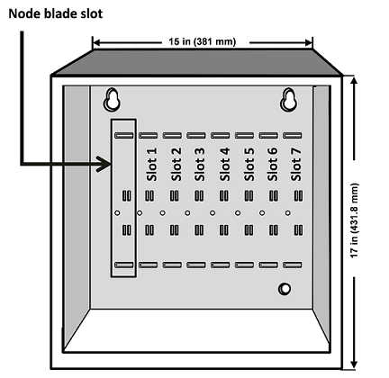 The Network Node enclosure has eight (8) slots in the aluminum chassis. The leftmost slot is reserved for the Network Node blade running the node software (Input Rated: 12V/178mA). The provided access control blade is mounted to its right, in Slot 1. The remaining slots, numbered 2 through 7, can hold any combination of access control, input, and output application extension blades.