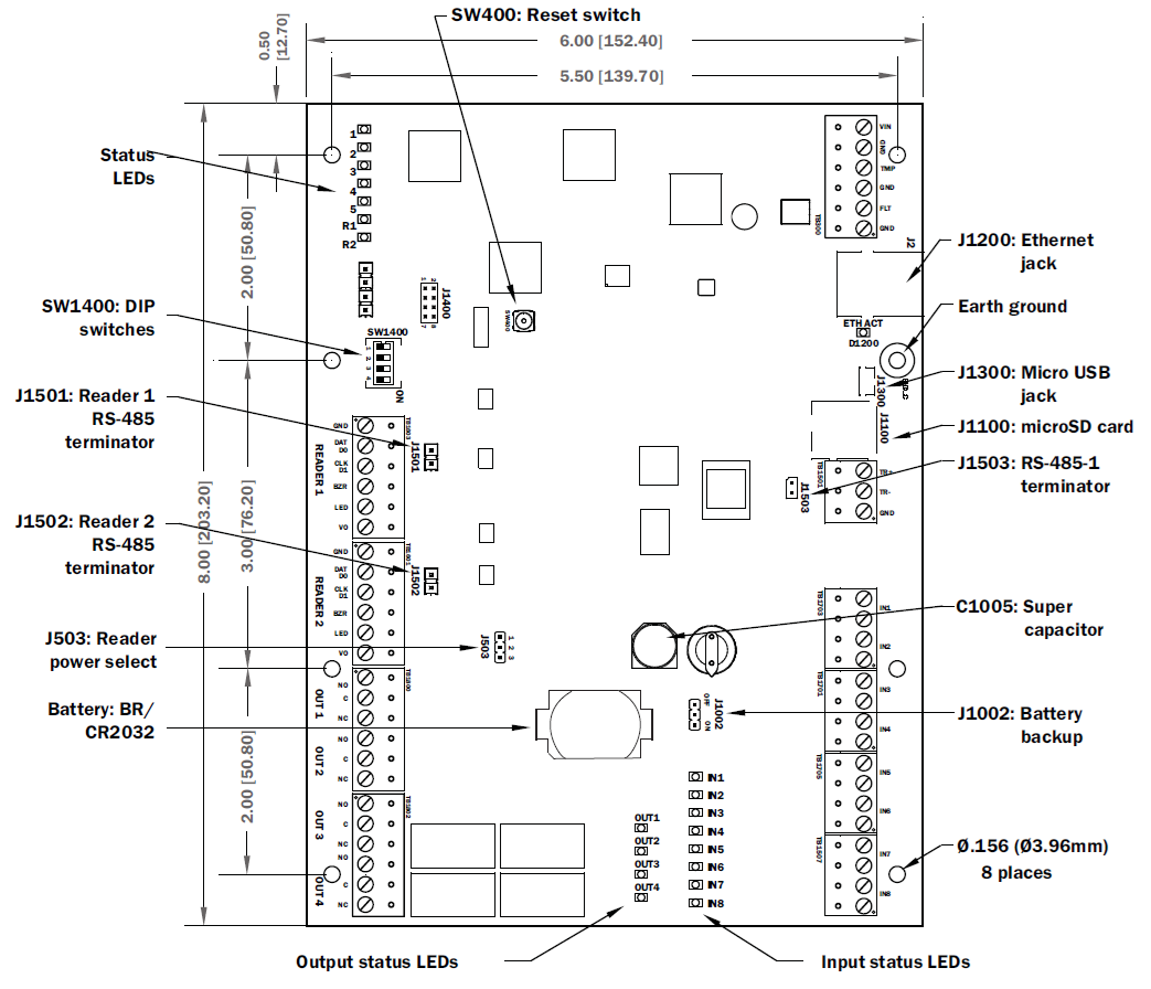 There are eight (8) inputs that are typically used to monitor door position, request to exit, or alarm contacts. Input circuits can be configured as unsupervised or supervised. When unsupervised, reporting consists of only the open or closed states. When configured as supervised, the input circuit will report not only open and closed, but also open circuit, shorted, grounded, and foreign voltage. A supervised input circuit requires two resistors be added to the circuit to facilitate proper reporting. The standard supervised circuit requires 1k ohm, 1% resistors and should be located as close to the sensor as possible. Custom end of line (EOL) resistances may be configured via the host software.