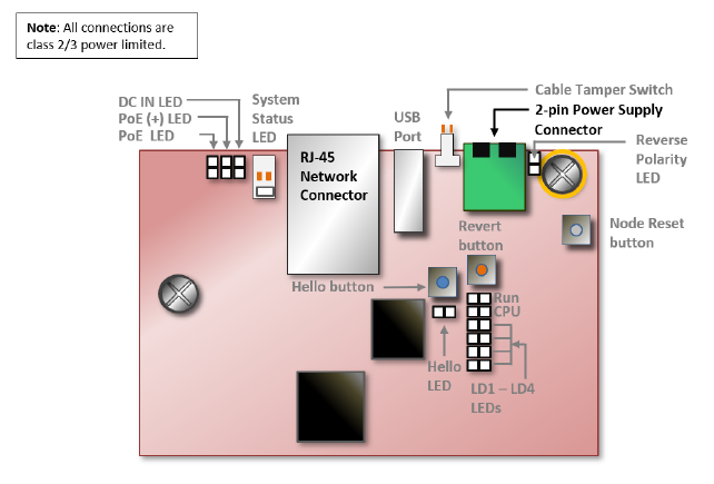 The Hello button is located near the Tamper Switch connector. | If a USB flash drive is plugged in to the node’s USB connector and the Hello button is pressed, the system will write its network configuration to or from the flash drive. This process takes about five seconds. |