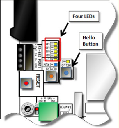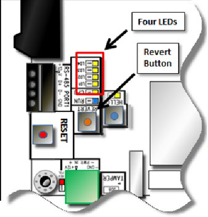 The Revert button is located near the green Power connector and the column of LEDs. | When you hold down the Revert button for at least 10 seconds, the four LEDs next to the button start to light up and then begin blinking on and off. Once all four buttons are blinking on and off at the same time, you can release the button and the revert will occur, returning the MicroNode Plus to its factory default settings: