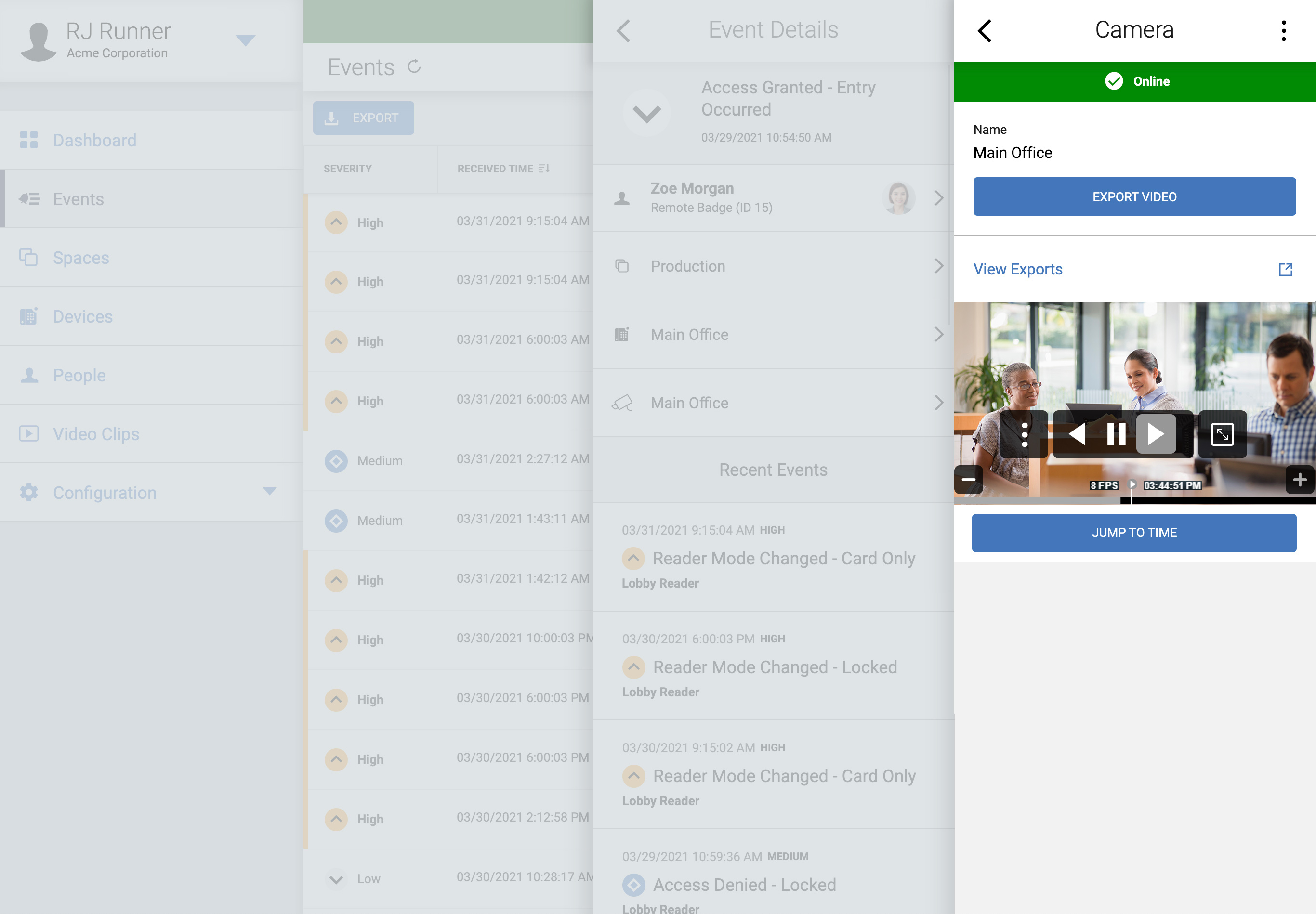 Associate video with events and view live/recorded video from the Events menu