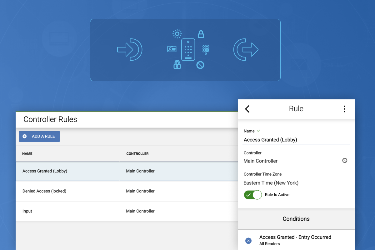 Controller rules allow you to configure automation locally on a single controller. Based on reader, input, or output activity, automate control of any reader, input, or output on that same controller.