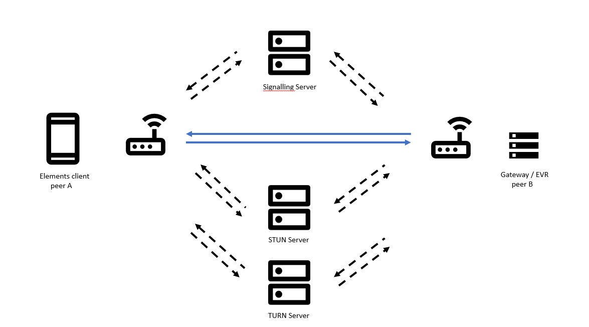 We want to establish a peer-to-peer connection between two hosts: the Elements client and the gateway or recorder. Both are behind NAT. They should know each other's public IP address and the type of media that is going to be sent.